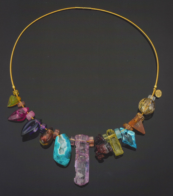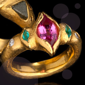 Die imposanten Ringe, Ohrringe und Armreifen sind individueller Schmuck ohne aufdringliche Stereotype, dessen Abstraktheit durch die Verwendung von außergewöhnlichen Edelsteinen